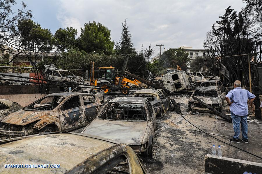 MATI, julio 24, 2018 (Xinhua) -- Un hombre observa vehículos quemados en Mati, un pueblo costero en el este de Atenas, Grecia, el 24 de julio de 2018. De acuerdo con información de la prensa local, el número de muertos por los incendios ocurridos cerca de Atenas se ha actualizado a 74 el martes por la tarde, mientras continúa la búsqueda por más víctimas en la costa este de Attica, informó la agencia nacional griega de noticias AMNA. (Xinhua/Lefteris Partsalis)