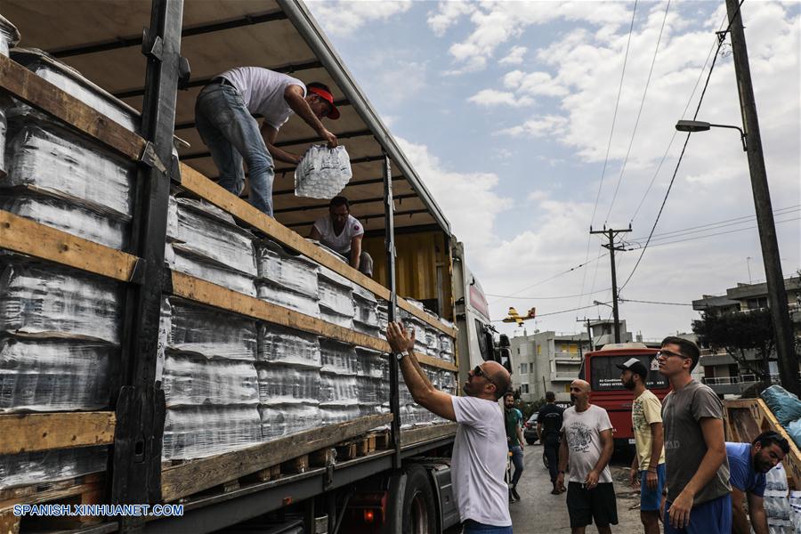 MATI, julio 24, 2018 (Xinhua) -- Voluntarios entregan agua embotellada en Mati, un pueblo costero en el este de Atenas, Grecia, el 24 de julio de 2018. De acuerdo con información de la prensa local, el número de muertos por los incendios ocurridos cerca de Atenas se ha actualizado a 74 el martes por la tarde, mientras continúa la búsqueda por más víctimas en la costa este de Attica, informó la agencia nacional griega de noticias AMNA. (Xinhua/Lefteris Partsalis)