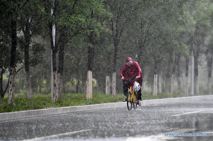 TIANJIN, julio 24, 2018 (Xinhua) -- Un hombre conduce una bicicleta bajo la lluvia, en el distrito de Xiqing de la municipalidad de Tianjin, en el norte de China, el 24 de julio de 2018. Las fuertes precipitaciones provocadas por el tifón Ampil afectaron el martes a Beijing y las zonas vecinas, causando retrasos en vuelos y evacuaciones de residentes, según las autoridades de control de inundaciones de la ciudad. (Xinhua/Li Ran)