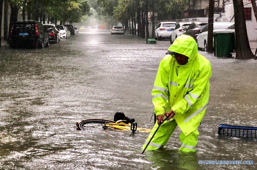 TIANJIN, julio 24, 2018 (Xinhua) -- Imagen tomada con un teléfono móvil de un trabajador desazolvando el drenaje en una calle inundada, en el distrito de Hexi de la municipalidad de Tianjin, en el norte de China, el 24 de julio de 2018. Las fuertes precipitaciones provocadas por el tifón Ampil afectaron el martes a Beijing y las zonas vecinas, causando retrasos en vuelos y evacuaciones de residentes, según las autoridades de control de inundaciones de la ciudad. (Xinhua/Wang Qingyan)