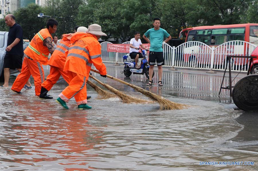 HEBEI, julio 24, 2018 (Xinhua) -- Trabajadores sanitarios barren el agua, en el condado de Dacheng de Langfang, provincia de Hebei, en el norte de China, el 24 de julio de 2018. Las fuertes precipitaciones provocadas por el tifón Ampil afectaron el martes a Beijing y las zonas vecinas, causando retrasos en vuelos y evacuaciones de residentes, según las autoridades de control de inundaciones de la ciudad. (Xinhua/Liu Liang)