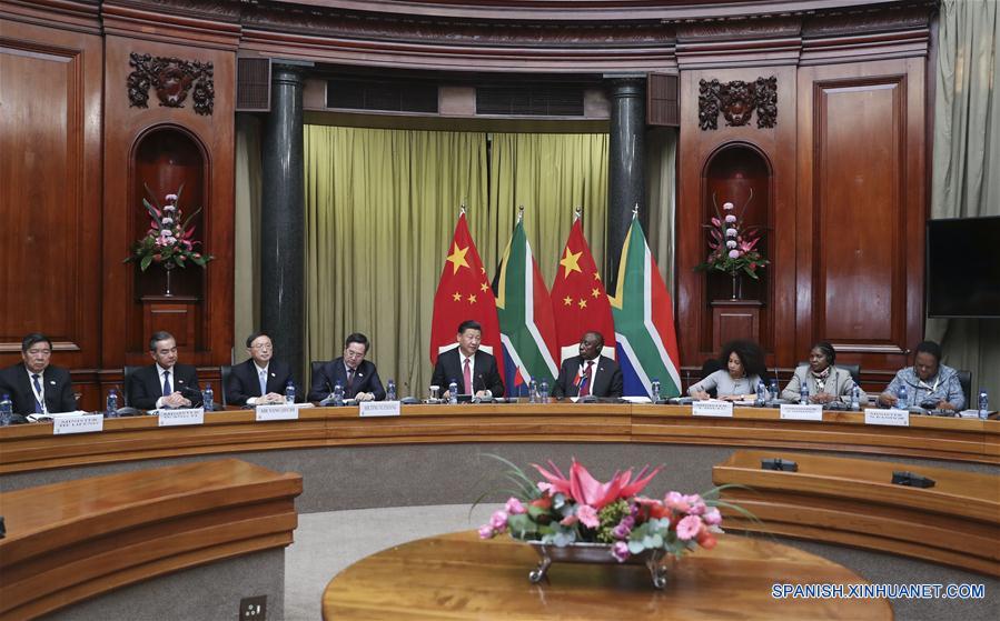 PRETORIA, julio 24, 2018 (Xinhua) -- El presidente de China, Xi Jinping (5-i), y su homólogo sudafricano, Cyril Ramaphosa (4-d), sostienen conversaciones en Pretoria, Sudáfrica, el 24 de julio de 2018. (Xinhua/Xie Huanchi)