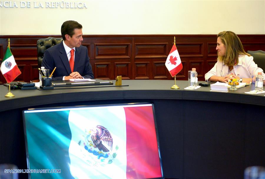 Imagen cedida por la Presidencia de México, del presidente mexicano, Enrique Pe?a Nieto (i), conversando con la ministra de Asuntos Exteriores de Canadá, Chrystia Freeland (d), durante una reunión en la Ciudad de México, capital de México, el 25 de julio de 2018. La modernización del Tratado de Libre Comercio de América del Norte (TLCAN), que inició hace casi un a?o, está en una etapa muy avanzada, aunque todavía enfrenta algunos retos hacia adelante, coincidieron el miércoles ministros de Canadá y México. (Xinhua/Presidencia de México)