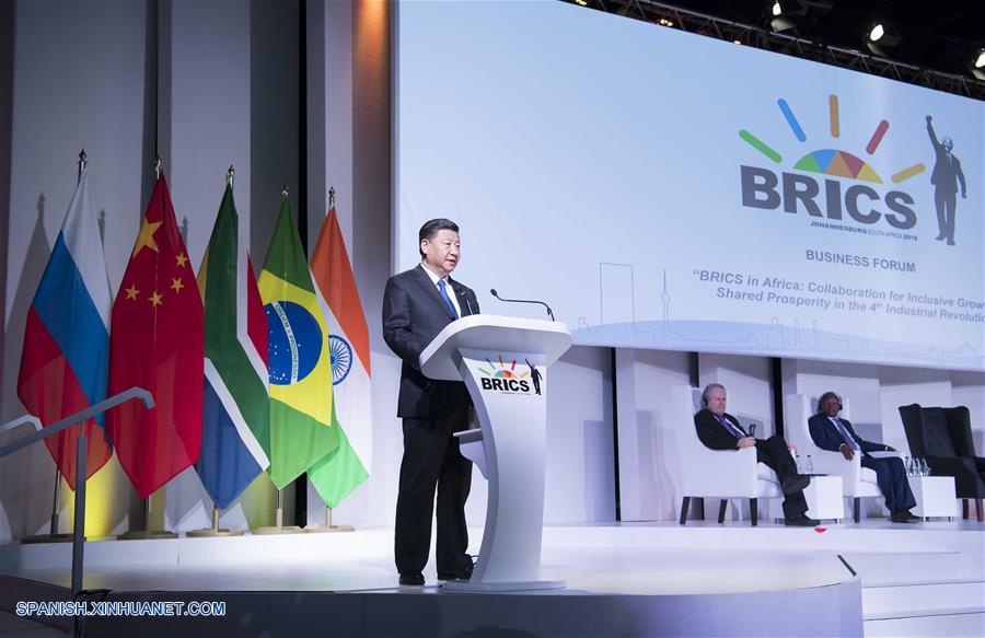 El presidente de China, Xi Jinping, pronuncia un discurso titulado "Adaptarse al corriente de los tiempos para lograr el desarrollo común" en el Foro Empresarial de los BRICS, en Johannesburgo, Sudáfrica, el 25 de julio de 2018. (Xinhua/Li Tao)