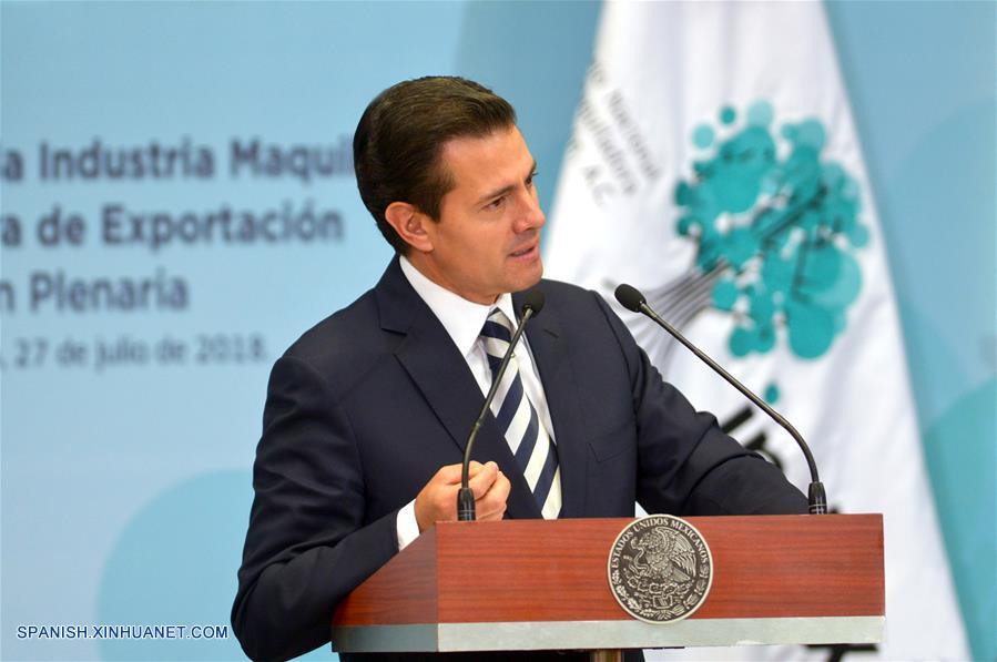 CIUDAD DE MEXICO, julio 27, 2018 (Xinhua) -- Imagen cedida por la Presidencia de México del presidente mexicano, Enrique Pe?a Nieto, pronunciando un discurso durante la reunión plenaria del Consejo Nacional de la Industria Maquiladora y Manufacturera de Exportación (INDEX), en la Ciudad de México, capital de México, el 27 de julio de 2018. El presidente de México, Enrique Pe?a Nieto, manifestó el viernes su confianza en que se alcancen acuerdos sobre la modernización del Tratado de Libre Comercio de América del Norte (TLCAN) en agosto próximo. (Xinhua/Presidencia de México)