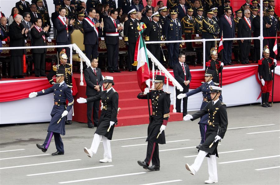 LIMA, julio 29, 2018 (Xinhua) -- El presidente peruano Martín Vizcarra (c-arriba), observa la Gran Parada y Desfile Cívico-Militar, en el marco de las celebraciones del 197 Aniversario de la Independencia de Perú, en la ciudad de Lima, Perú, el 29 de julio de 2018. De acuerdo con información de la prensa local, residentes de Lima y del interior del país asistieron el domingo a la avenida Brasil para presenciar la Gran Parada y Desfile Cívico-Militar y celebrar el 197 Aniversario de la Independencia de Perú. (Xinhua/Luis Camacho)