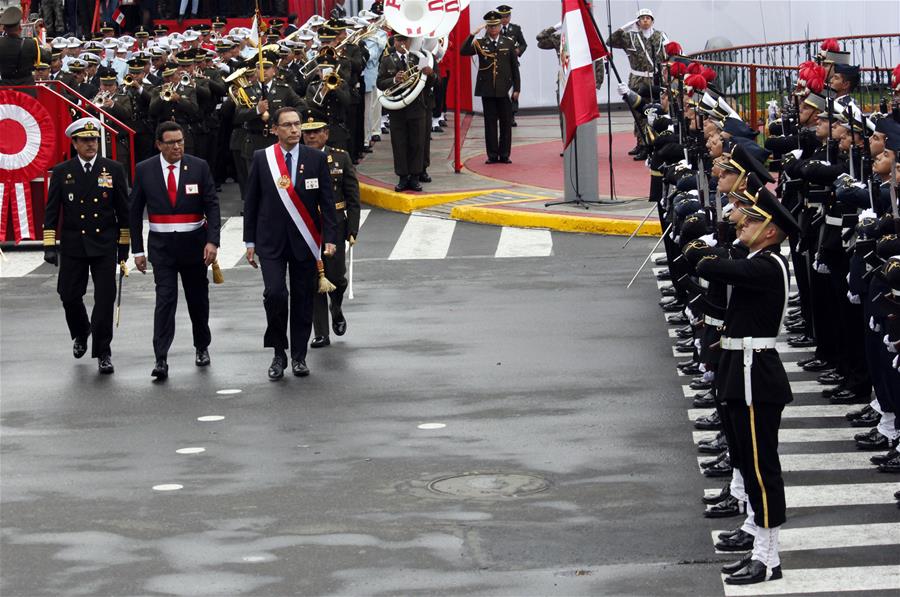 LIMA, julio 29, 2018 (Xinhua) -- El presidente peruano Martín Vizcarra (3-i), pasa revista militar durante la Gran Parada y Desfile Cívico-Militar, en el marco de las celebraciones del 197 Aniversario de la Independencia de Perú, en la ciudad de Lima, Perú, el 29 de julio de 2018. De acuerdo con información de la prensa local, residentes de Lima y del interior del país asistieron el domingo a la avenida Brasil para presenciar la Gran Parada y Desfile Cívico-Militar y celebrar el 197 Aniversario de la Independencia de Perú. (Xinhua/Luis Camacho)