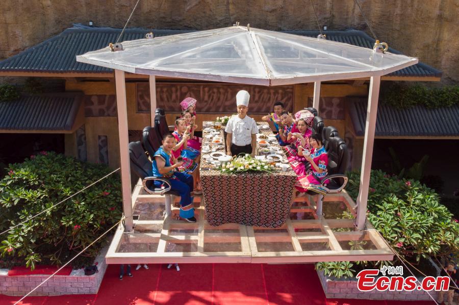 Guilin, Guangxi, 31/07/2018 (Pueblo en Línea) – Los participantes enfrentan el desafío de comer fideos de arroz en un espacio transparente, elevado a 50 metros de altura, cerca de una estatua gigante en un centro turístico de Guilin, región autónoma de Guangxi, 29 de julio del 2018. Sobrecogidos, los participantes renunciaron cuando se elevaron apenas diez metros del piso. (Foto: Chen Chen/ Servicios de noticias de China)