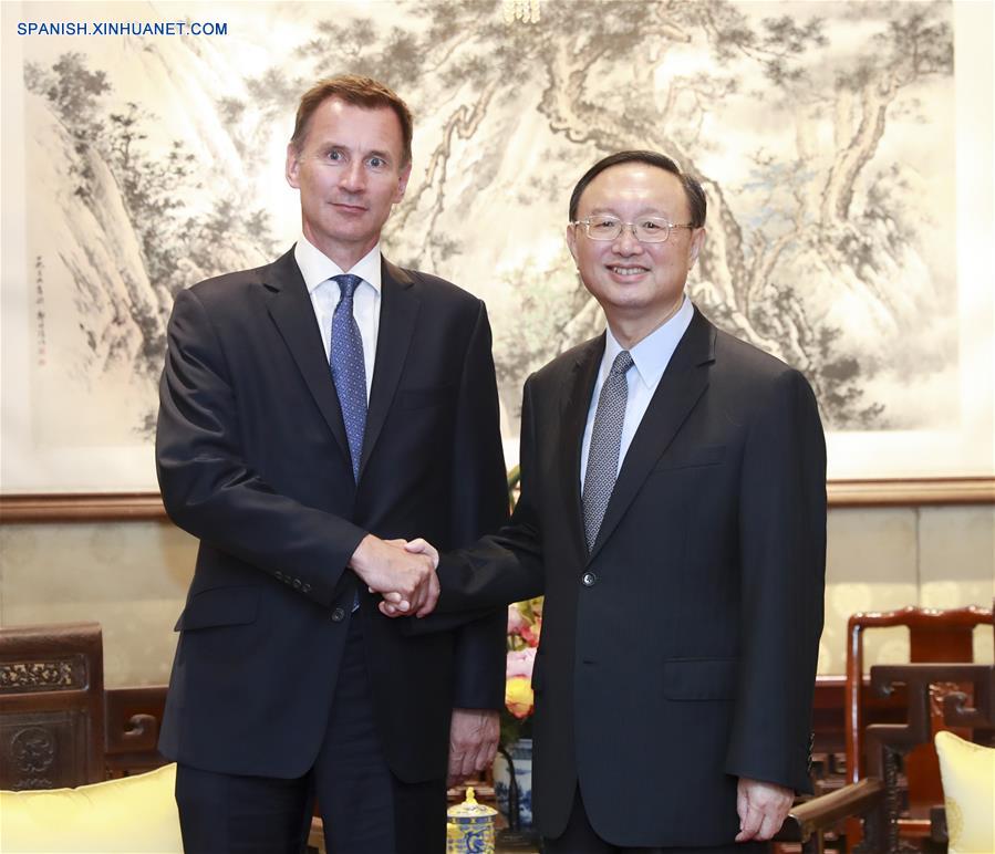 BEIJING, 30 jul (Xinhua) -- Yang Jiechi, miembro del Buró Político del Comité Central del Partido Comunista de China (PCCh), se reunió hoy en Beijing con el secretario de Relaciones Exteriores de Reino Unido, Jeremy Hunt.