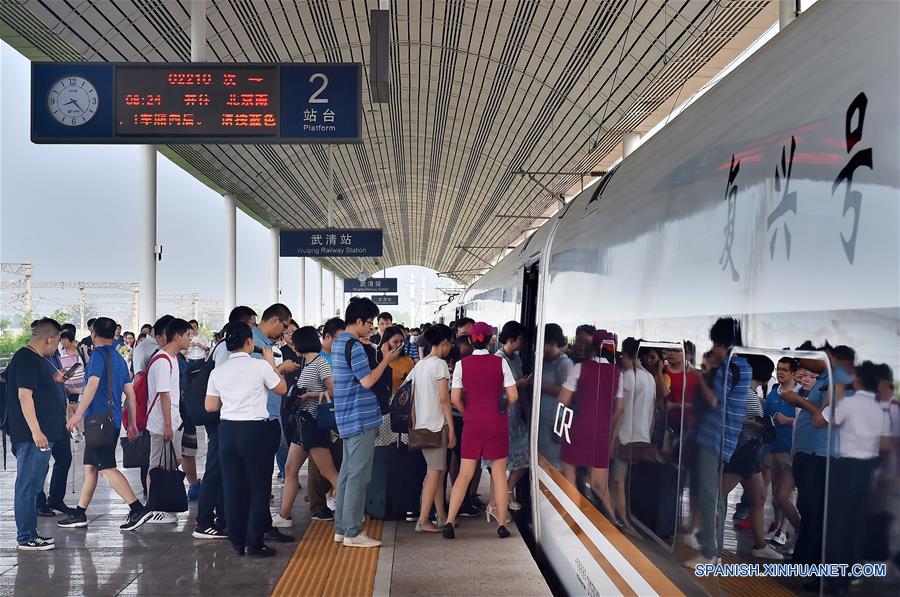 TIANJIN, agosto 1, 2018 (Xinhua) -- Pasajeros esperan en fila para abordar un tren interurbano Beijing-Tianjin en la Estación del Ferrocarril Wuqing, en Tianjin, en el norte China, el 1 de agosto de 2018. El servicio del ferrocarril de alta velocidad Beijing-Tianjin abrió la primera línea del ferrocarril de alta velocidad de China. La frecuencia diaria de los trenes interurbanos Beijing-Tianjin se ha incrementado de 94 servicios de ida a 217, con 250 millones de pasajeros transportados en la última década, de acuerdo con el Buró del Ferrocarril de Beijing. (Xinhua/Yang Baosen)