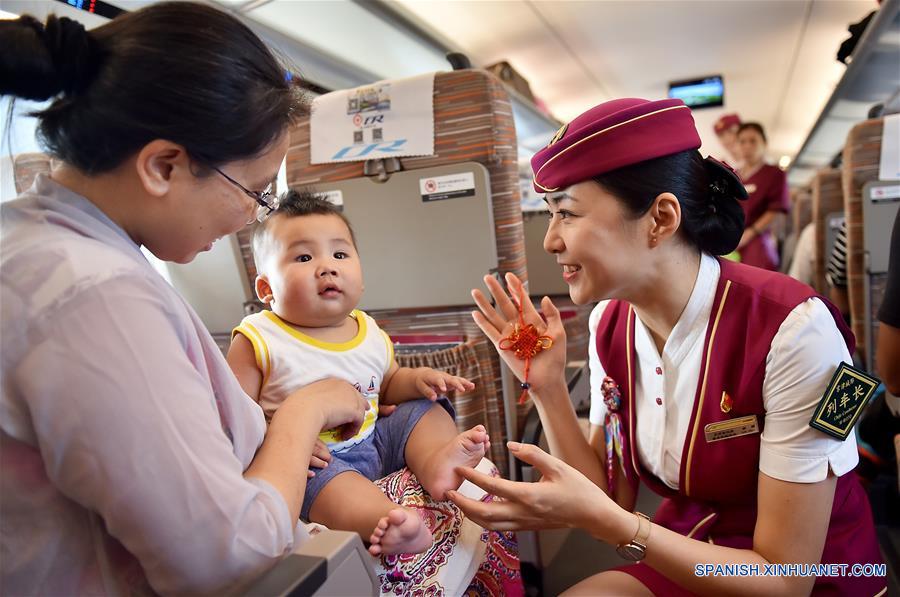 TIANJIN, agosto 1, 2018 (Xinhua) -- La supervisora de asistente de tren Xu Ying proporciona servicio a los pasajeros a bordo de un tren interurbano Beijing-Tianjin, en Tianjin, en el norte China, el 1 de agosto de 2018. El servicio del ferrocarril de alta velocidad Beijing-Tianjin abrió la primera línea del ferrocarril de alta velocidad de China. La frecuencia diaria de los trenes interurbanos Beijing-Tianjin se ha incrementado de 94 servicios de ida a 217, con 250 millones de pasajeros transportados en la última década, de acuerdo con el Buró del Ferrocarril de Beijing. (Xinhua/Yang Baosen)