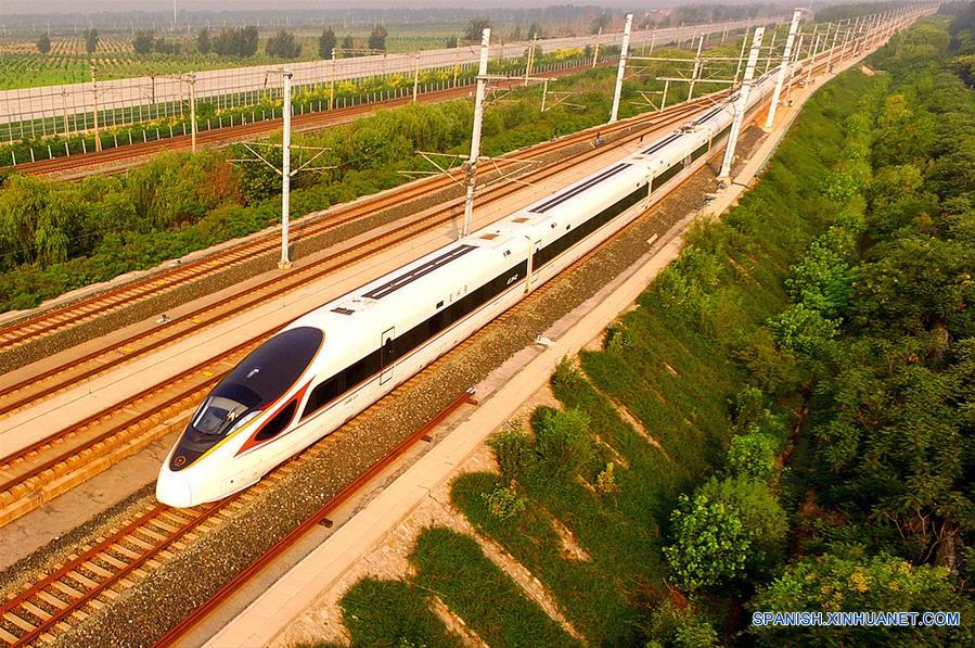 TIANJIN, agosto 1, 2018 (Xinhua) -- Vista aérea de un tren interurbano Beijing-Tianjin llegando a la Estación del Ferrocarril Wuqing, en Tianjin, en el norte China, el 1 de agosto de 2018. El servicio del ferrocarril de alta velocidad Beijing-Tianjin abrió la primera línea del ferrocarril de alta velocidad de China. La frecuencia diaria de los trenes interurbanos Beijing-Tianjin se ha incrementado de 94 servicios de ida a 217, con 250 millones de pasajeros transportados en la última década, de acuerdo con el Buró del Ferrocarril de Beijing. (Xinhua/Dong Xin)