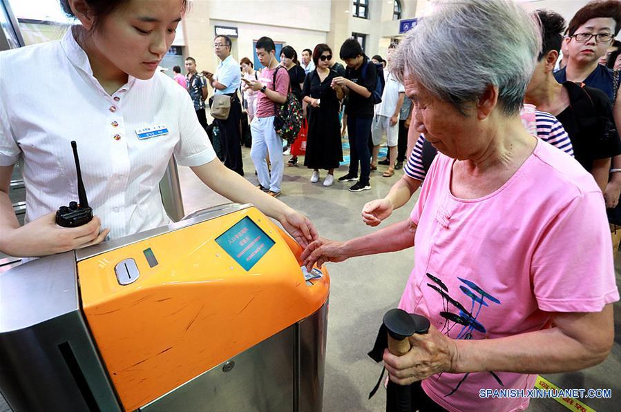 TIANJIN, agosto 1, 2018 (Xinhua) -- Pasajeros del tren interurbano Beijing-Tianjin checan sus boletos en la Estación del Ferrocarril Wuqing, en Tianjin, en el norte China, el 1 de agosto de 2018. El servicio del ferrocarril de alta velocidad Beijing-Tianjin abrió la primera línea del ferrocarril de alta velocidad de China. La frecuencia diaria de los trenes interurbanos Beijing-Tianjin se ha incrementado de 94 servicios de ida a 217, con 250 millones de pasajeros transportados en la última década, de acuerdo con el Buró del Ferrocarril de Beijing. (Xinhua/Dong Xin)
