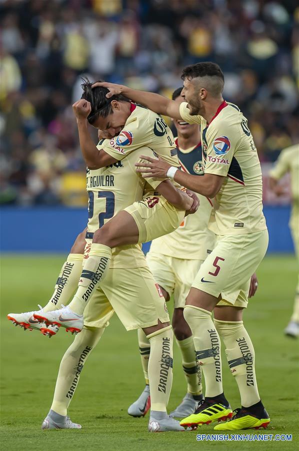 El jugador Diego Lainez (2-d-frente), de América, festeja su anotación con sus compa?eros de equipo durante un partido correspondiente a la Jornada 3 del Torneo Apertura 2018 de la Liga MX, ante Pachuca, celebrado en el Estadio Hidalgo, en la ciudad de Pachuca, estado de Hidalgo, México, el 4 de agosto de 2018. (Xinhua/César Vicu?a)