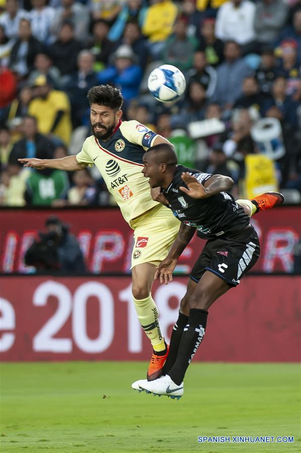 El jugador Oscar Murillo (d), de Pachuca, disputa el balón con Oribe Peralta (i), de América, durante un partido correspondiente a la Jornada 3 del Torneo Apertura 2018 de la Liga MX, celebrado en el Estadio Hidalgo, en la ciudad de Pachuca, estado de Hidalgo, México, el 4 de agosto de 2018. (Xinhua/César Vicu?a)