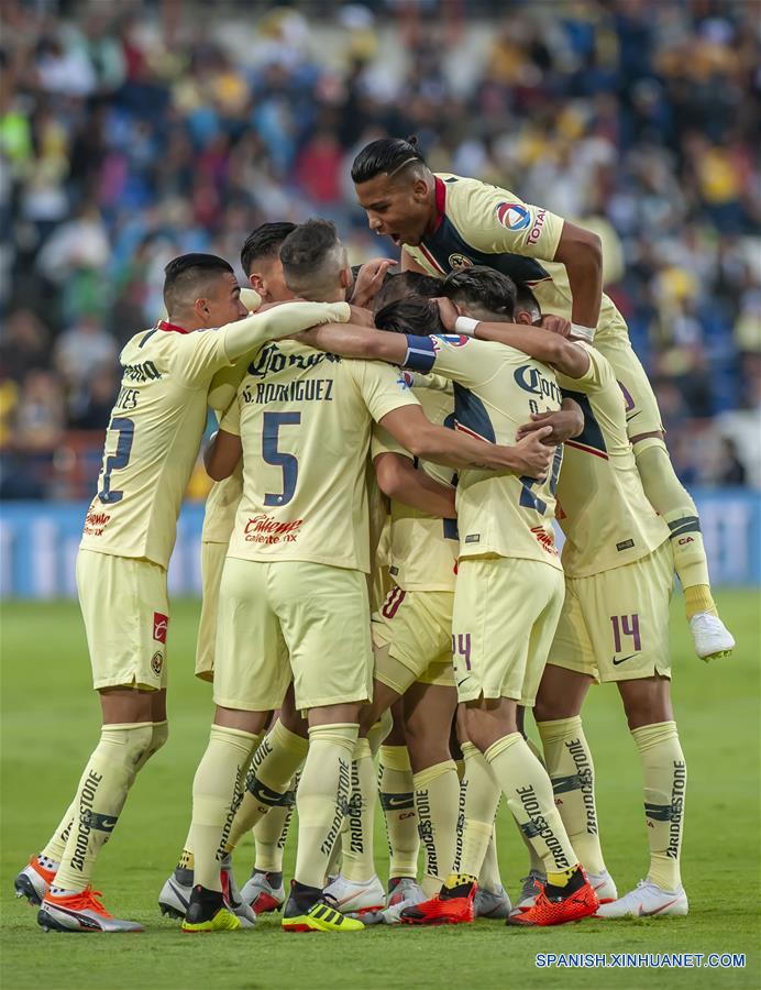 HIDALGO, agosto 4, 2018 (Xinhua) -- El jugador Diego Lainez (c), de América, festeja su anotación con sus compa?eros de equipo durante un partido correspondiente a la Jornada 3 del Torneo Apertura 2018 de la Liga MX, ante Pachuca, celebrado en el Estadio Hidalgo, en la ciudad de Pachuca, estado de Hidalgo, México, el 4 de agosto de 2018. (Xinhua/César Vicu?a)