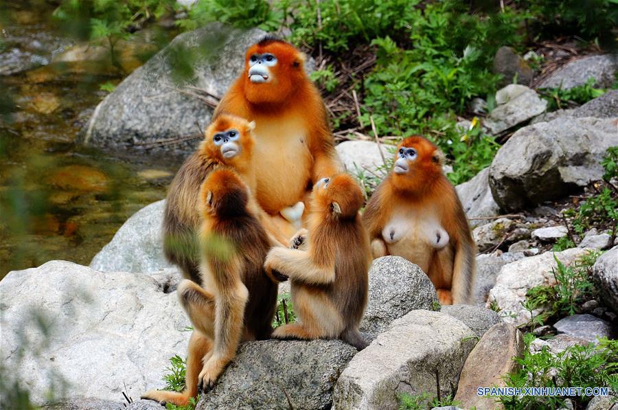 Imagen del 3 de agosto de 2018 de monos dorados descansando en el valle del panda gigante de la Monta?a Qinling en el condado de Foping, provincia de Shaanxi, en el noroeste de China. Los monos dorados de Qinling están bajo protección de primer nivel de China. Su número se ha elevado de 3,000 en 1998 a 5,000 en el presente gracias a la mejora del medio ambiente y el trabajo de protección. (Xinhua/Liu Xiao)