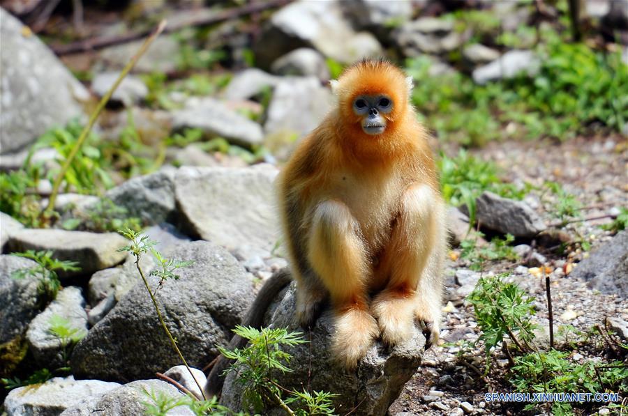 Imagen del 3 de agosto de 2018 de un mono dorado jugando en el valle del panda gigante de la Monta?a Qinling en el condado de Foping, provincia de Shaanxi, en el noroeste de China. Los monos dorados de Qinling están bajo protección de primer nivel de China. Su número se ha elevado de 3,000 en 1998 a 5,000 en el presente gracias a la mejora del medio ambiente y el trabajo de protección. (Xinhua/Liu Xiao)