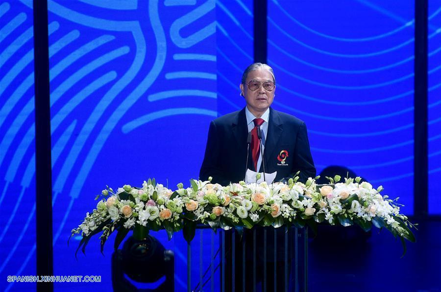 HANGZHOU, agosto 6, 2018 (Xinhua) -- El vicepresidente del Consejo Olímpico de Asia, Fok Tsun-ting, pronuncia un discurso durante la Ceremonia de Lanzamiento del Emblema de los 19 Juegos Asiáticos Hangzhou 2022, en Hangzhou, capital de la provincia de Zhejiang, en el este de China, el 6 de agosto de 2018. (Xinhua/Huang Zongzhi)