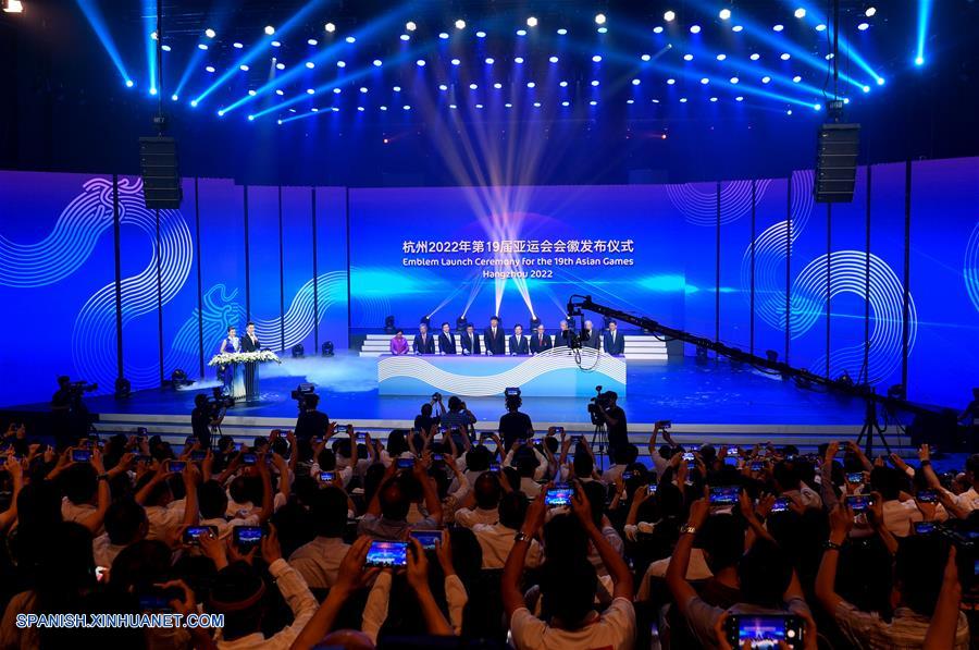 HANGZHOU, agosto 6, 2018 (Xinhua) -- Vista del Emblema oficial de los 19 Juegos Asiáticos Hangzhou 2022, durante su ceremonia de lanzamiento, en Hangzhou, capital de la provincia de Zhejiang, en el este de China, el 6 de agosto de 2018. (Xinhua/Huang Zongzhi)