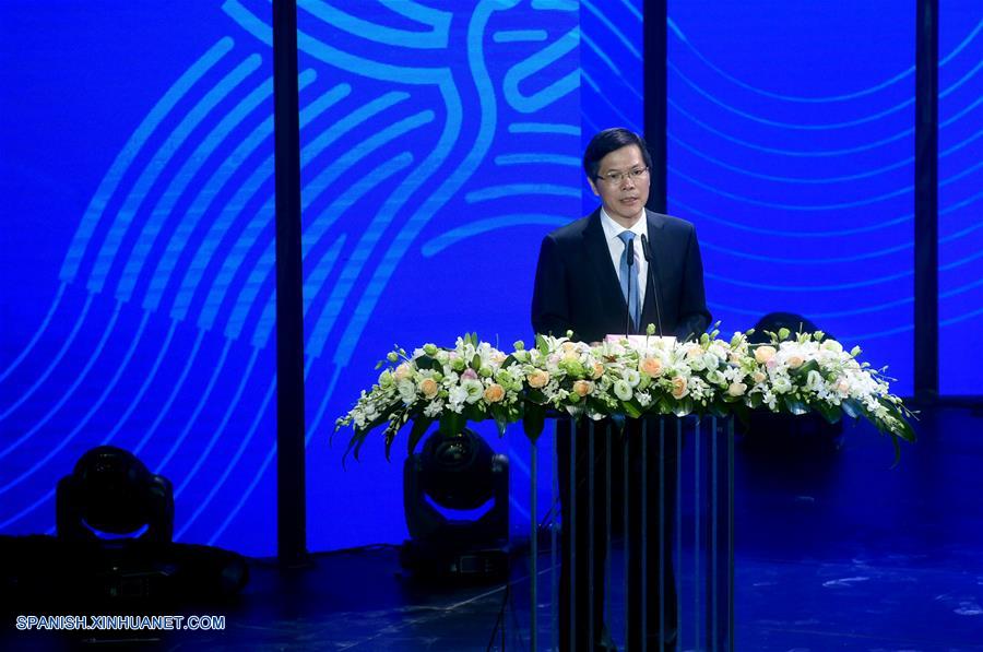 HANGZHOU, agosto 6, 2018 (Xinhua) -- El alcalde de Hangzhou, Xu Liyi, pronuncia un discurso durante la Ceremonia de Lanzamiento del Emblema de los 19 Juegos Asiáticos Hangzhou 2022, en Hangzhou, capital de la provincia de Zhejiang, en el este de China, el 6 de agosto de 2018. (Xinhua/Huang Zongzhi)