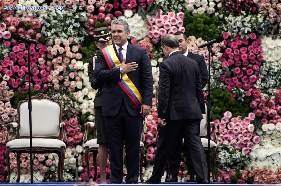 El presidente de Colombia, Iván Duque (i), participa en su ceremonia de juramentación, en la Plaza Bolívar, en Bogotá, Colombia, el 7 de agosto de 2018. El presidente colombiano, Iván Duque, tomó el martes juramento como el mandatario número 60 del país andino, y se convirtió en el cuarto jefe de Estado más joven en tomar posesión de ese cargo, que asumirá por un periodo de cuatro a?os y reemplazará al saliente Juan Manuel Santos. (Xinhua/Jhon Paz)