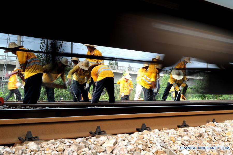 Trabajadores revisan el tendido férreo, en Shanghai, en el este de China, el 7 de agosto de 2018. El personal de mantenimiendo del ferrocarril en Shanghai permanece en sus puestos de trabajo a pesar del clima caluroso para garantizar la seguridad de los pasajeros. (Xinhua/Chen Fei)