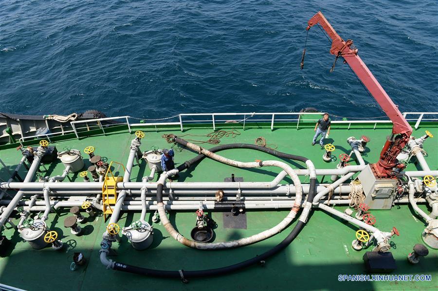Vista del buque petrolero sudcoreano durante el reabastecimiento de combustible del buque Tian'en de la compa?ía COSCO Shipping Specialized Carriers Co., Ltd. de China en aguas del mar de Busan, mientras navega hacia Europa través de la "Ruta de la Seda Polar", el 7 de agosto de 2018. (Xinhua/Liu Hongxia)
