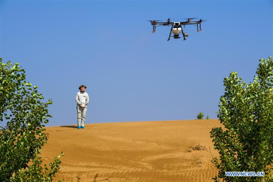 Un técnico controla un dron para sembrar semillas en el desierto Kubuqi, región autónoma de Mongolia Interior, al norte de China. Kubuqi, el séptimo desierto más grande de China, es un buen ejemplo del éxito de China en la lucha contra la desertificación. Alrededor de 6.460 kilómetros cuadrados del desierto de Kubuqi han sido recuperados en los últimos 30 a?os. (Xinhua / Peng Yuan)