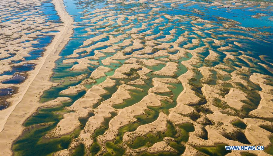 Hangjin Banner, Mongolia Interior, 09/08/2018 (Pueblo en Línea) – Foto aérea del 9 de junio de 2018 muestra los humedales formados por las aguas del río Amarillo en período de inundación en el desierto Kubuqi en Hangjin Banner, región autónoma de Mongolia Interior, al norte de China. Kubuqi, el séptimo desierto más grande de China, es un buen ejemplo del éxito de China en la lucha contra la desertificación. Alrededor de 6.460 kilómetros cuadrados del desierto de Kubuqi han sido recuperados en los últimos 30 a?os. (Xinhua / Peng Yuan)