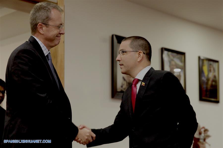 CARACAS, agosto 8, 2018 (Xinhua) -- El canciller venezolano, Jorge Arreaza (d), estrecha la mano con el encargado de Negocios de Estados Unidos acreditado en el país, James Story (i), durante su reunión en Caracas, Venezuela, el 8 de agosto de 2018. El canciller venezolano, Jorge Arreaza, entregó el miércoles un informe preliminar al encargado de Negocios de Estados Unidos acreditado en el país, James Story, sobre el "magnicidio en grado de frustración" contra el presidente Nicolás Maduro. Asimismo, solicitará la extradición del autor intelectual del atentado, Osman Alexis Delgado Tabosky. (Xinhua/Ricardo Herdenez/AVN)