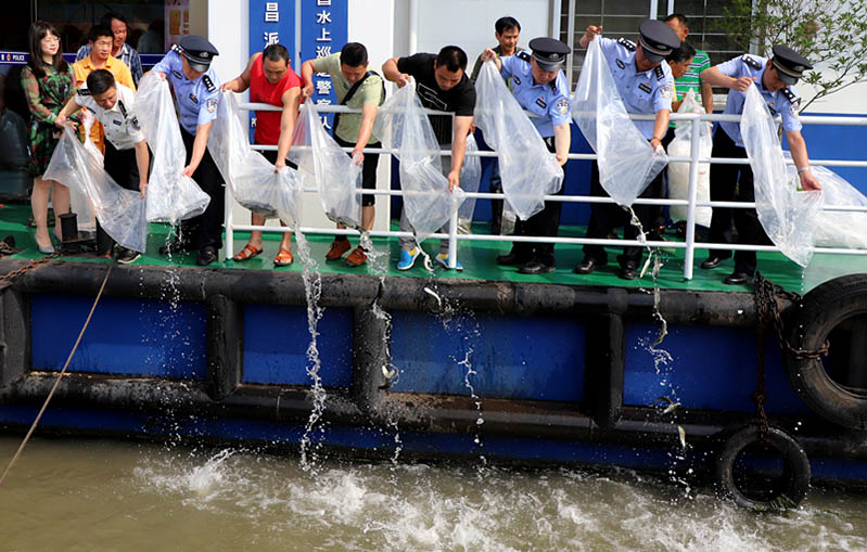 Oficiales de policía liberan peque?os peces en una sección del río Yangtze de Wuhan, provincia de Hubei, 15 de mayo del 2018. (Foto: China Daily)