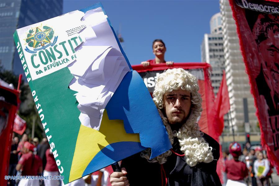 SAO PAULO, agosto 10, 2018 (Xinhua) -- Una persona sosteniendo un cartel participa durante la movilización "El día del basta", frente a la Federación de las Industrias del Estado de Sao Paulo (FIESP), en el centro de Sao Paulo, Brasil, el 10 de agosto de 2018. Ocho de las principales centrales sindicales de Brasil se manifestaron hoy en al menos 14 ciudades del país contra el desempleo, la reforma laboral y la reforma de la seguridad social que busca aprobar el gobierno. Los manifestantes también pidieron la libertad del ex presidente Luiz Inácio Lula da Silva (2003-2010), quien actualmente está preso. (Xinhua/Dario Oliveira/ZUMAPRESS)