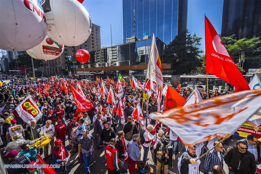 SAO PAULO, agosto 10, 2018 (Xinhua) -- Personas participan durante la movilización "El día del basta", frente a la Federación de las Industrias del Estado de Sao Paulo (FIESP), en el centro de Sao Paulo, Brasil, el 10 de agosto de 2018. Ocho de las principales centrales sindicales de Brasil se manifestaron hoy en al menos 14 ciudades del país contra el desempleo, la reforma laboral y la reforma de la seguridad social que busca aprobar el gobierno. Los manifestantes también pidieron la libertad del ex presidente Luiz Inácio Lula da Silva (2003-2010), quien actualmente está preso. (Xinhua/Cris Faga /ZUMAPRESS)