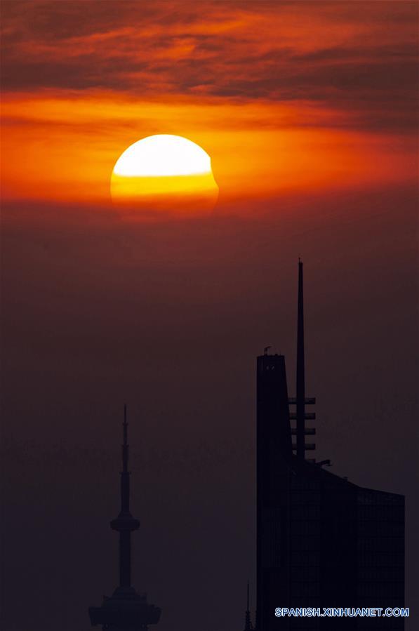JIANGSU, agosto 11, 2018 (Xinhua) -- Vista del sol pasando por un eclipse solar parcial, en Nanjing, capital de la provincia de Jiangsu, en el este de China, el 11 de agosto de 2018. (Xinhua/Su Yang)
