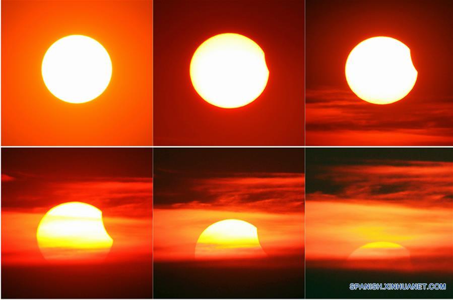 JIANGSU, agosto 11, 2018 (Xinhua) -- Imagen combinada de una vista del proceso de un eclipse solar parcial, en la ciudad de Changzhou, provincia de Jiangsu, en el este de China, el 11 de agosto de 2018. (Xinhua/Chen Wei)