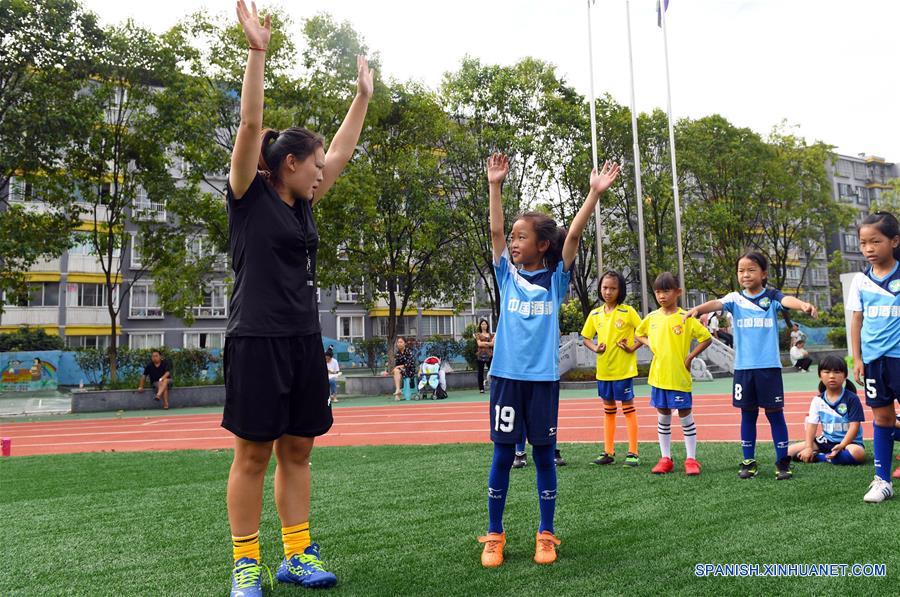 GUIZHOU, agosto 9, 2018 (Xinhua) -- Alumnas realizan ejercicio de relajación bajo la guía de una entrenadora en la Escuela Primaria Experimental Renhuai, en Renhuai, provincia de Guizhou, en el suroeste de China, el 9 de agosto de 2018. (Xinhua/Chen Yong)