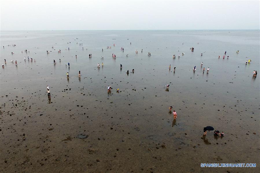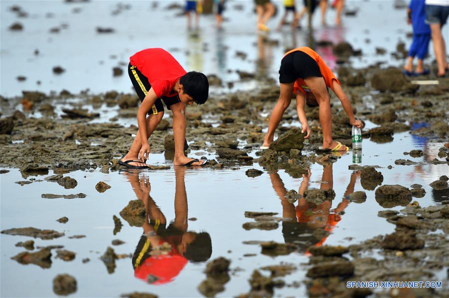 Visitantes se unen en la búsqueda de conchas y cangrejos a lo largo de la playa de la Bahía de Tanmen, en la ciudad de Qionghai, provincia de Hainan, en el sur de China, el 11 de agosto de 2018. (Xinhua/Guo Cheng)