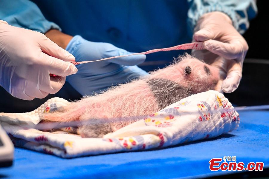 Un experto examina al panda gigante recién nacido Tingzai en el Parque Safari Chimelong en Guangzhou, provincia de Guangdong, el 12 de agosto de 2018. [Foto / China News Service]