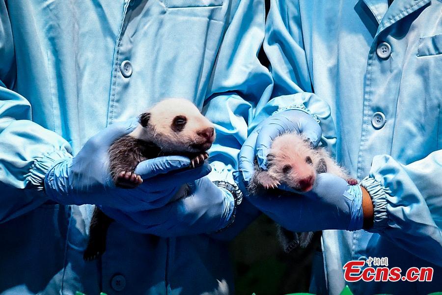 Guangzhou, Guangdong, 13/08/2018 (Pueblo en Línea) – Expertos muestran los resultados del examen de los pandas gigantes recién nacidos Longzai (izquierda) y Tingzai (derecha) en el Parque Safari Chimelong en Guangzhou, provincia de Guangdong, el 12 de agosto de 2018. Longzai nació el 12 de julio y Tingzai el 29 de julio. Los dos cachorros de panda gigante se sometieron a un examen físico completo el domingo en Guangzhou. [Foto / China News Service]