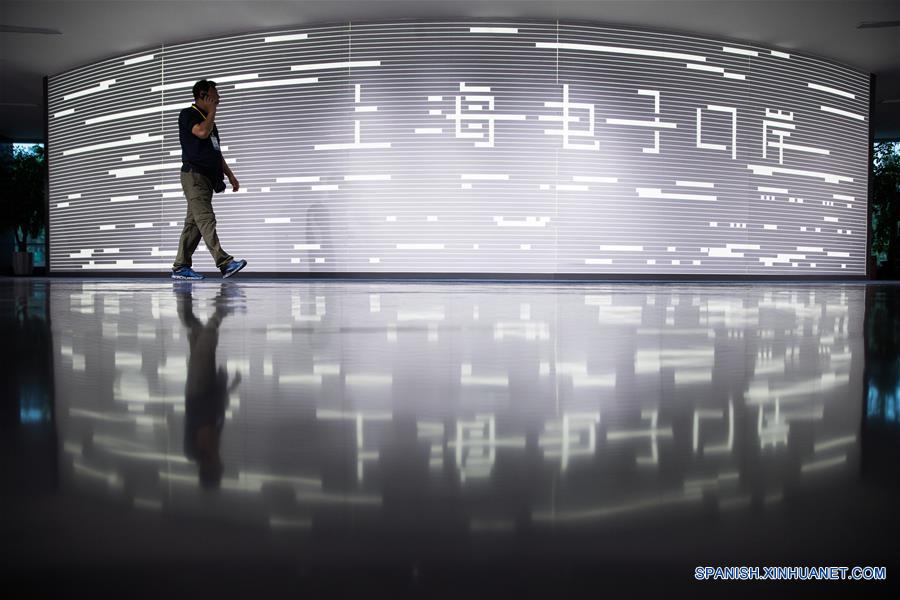SHANGHAI, agosto 12, 2018 (Xinhua) -- Un hombre camina frente a un letrero del puerto electrónico de Shanghai, en Shanghai, en el este de China, el 12 de agosto de 2018. Conectando a 22 departamentos gubernamentales, la Ventanilla Unica para el Comercio Internacional de Shanghai de China proporciona servicios que cubren un tercio del volumen total del comercio de exportaciones e importaciones de China. En la actualidad, más de 270,000 empresas han disfrutado de los servicios de la ventanilla única, la cual les permite completar procedimientos administrativos para el comercio exterior. (Xinhua/Jin Liwang)