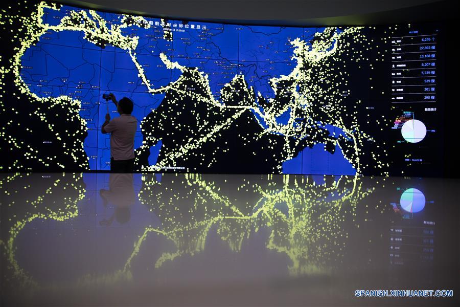 SHANGHAI, agosto 12, 2018 (Xinhua) -- Una persona toma una fotografía a una pantalla que presenta coordenadas en tiempo real de embarcaciones alrededor del mundo en Shanghai, en el este de China, el 12 de agosto de 2018. Conectando a 22 departamentos gubernamentales, la Ventanilla Unica para el Comercio Internacional de Shanghai de China proporciona servicios que cubren un tercio del volumen total del comercio de exportaciones e importaciones de China. En la actualidad, más de 270,000 empresas han disfrutado de los servicios de la ventanilla única, la cual les permite completar procedimientos administrativos para el comercio exterior. (Xinhua/Jin Liwang)