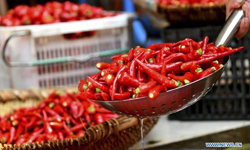 Un aldeano ordena los pimientos rojos secos en un mercado de la ciudad de Zunyi, provincia de Guizhou. Con una zona de cultivo de más de 2 millones de MU (alrededor de 133.333 hectáreas) y 40 fábricas de procesamiento, sus productos se abren paso en el extranjero. La industria de la pimienta en Zunyi se ha convertido en una manera eficaz para que los residentes locales logren salir de la pobreza. 11 de agosto del 2018. (Foto: Xinhua/Luo Xinghan)