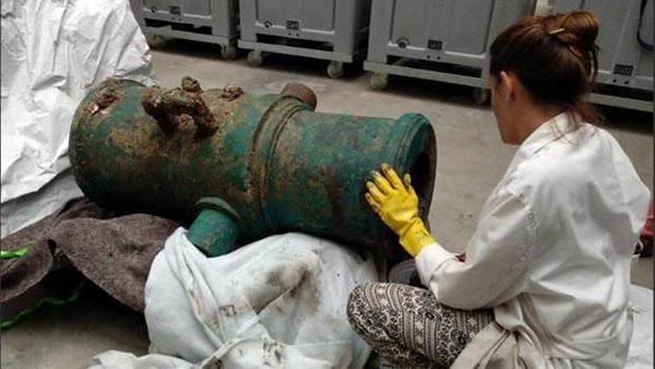 La pieza de artillería, que ha sido encontrada a unos veinte metros del extremo del Muelle de Levante del Puerto de Cádiz, ha aparecido aislada y sin conexión con otros elementos arqueológicos que indicasen la presencia de una nave que haya naufragado.