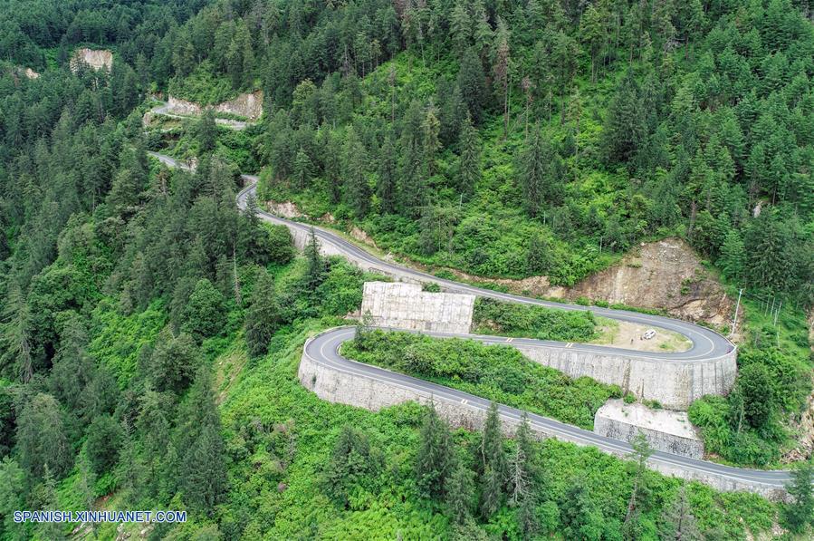 GYIRONG, agosto 13, 2018 (Xinhua) -- Imagen del 12 de agosto de 2018 de la vista aérea de un camino sinuoso en la monta?a de la autopista Gyirong Pass, en el condado Gyirong de la ciudad de Xigaze, Región Autónoma del Tíbet, en el suroeste de China. La autopista Gyirong Pass, una sección de 94 kilómetros de la Autopista Nacional 216, es una importante ruta de comercio que conecta a China y a Nepal. La carretera fue afectada gravemente por el devastador terremoto ocurrido en Nepal en abril de 2015. Ahora la carretera ha retomado vitalidad y tiene un nuevo aspecto después de a?os de reparación y reconstrucción, mientras el volumen anual del comercio del Puerto de Gyirong creció casi siete veces desde el periodo post-terremoto a alcanzar los 2.8 billones de yuanes (414 millones de dólares estadounidenses) en 2017. (Xinhua/Liu Dongjun)