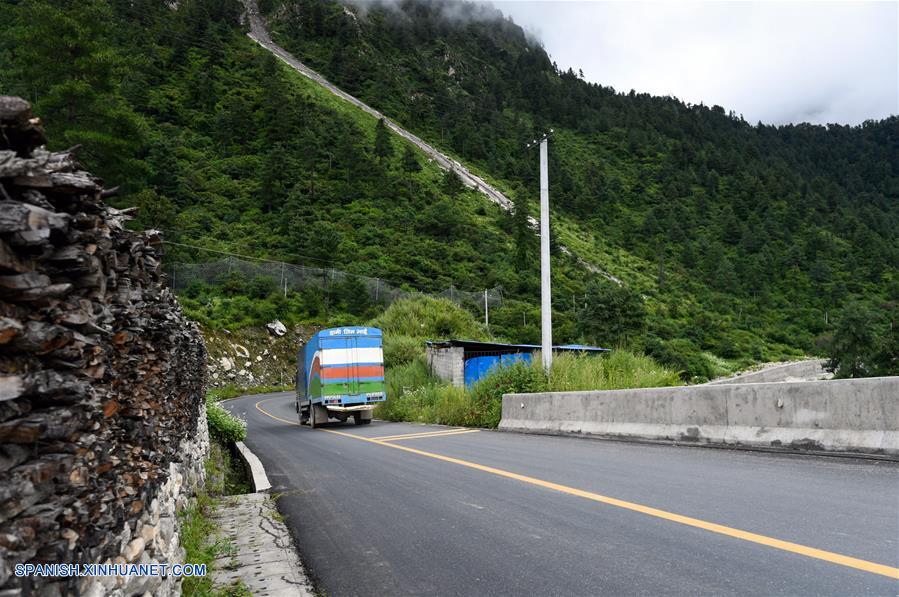 GYIRONG, agosto 13, 2018 (Xinhua) -- Imagen del 12 de agosto de 2018 de un autobús avanzando por la autopista Gyirong Pass, en el condado Gyirong de la ciudad de Xigaze, Región Autónoma del Tíbet, en el suroeste de China. La autopista Gyirong Pass, una sección de 94 kilómetros de la Autopista Nacional 216, es una importante ruta de comercio que conecta a China y a Nepal. La carretera fue afectada gravemente por el devastador terremoto ocurrido en Nepal en abril de 2015. Ahora la carretera ha retomado vitalidad y tiene un nuevo aspecto después de a?os de reparación y reconstrucción, mientras el volumen anual del comercio del Puerto de Gyirong creció casi siete veces desde el periodo post-terremoto a alcanzar los 2.8 billones de yuanes (414 millones de dólares estadounidenses) en 2017. (Xinhua/Liu Dongjun)