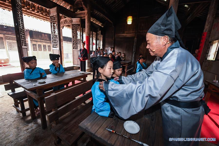 ZHEJIANG, agosto 12, 2018 (Xinhua) -- Un maestro arregla la ropa de estudiantes en una escuela privada de estilo antiguo en la aldea Zhongshan, en el condado de Changxing, provincia de Zhejiang, en el este de China, el 12 de agosto de 2018. (Xinhua/Xu Yu)