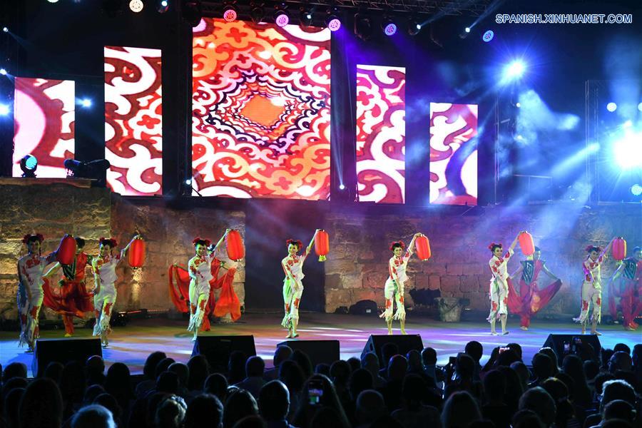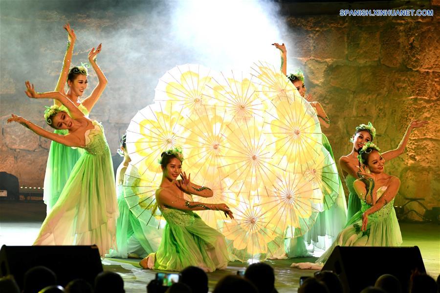 TUNEZ, agosto 12, 2018 (Xinhua) -- Imagen del 11 de agosto de 2018 de artistas chinas realizando un espectáculo en el Anfiteatro de Cártago, en Túnez, capital de Túnez. De acuerdo con información de la prensa local, el anfiteatro romano, construido en el siglo II con una capacidad de 10,000 espectadores, se llenó de audiencia tunecina deslumbrada por la Compa?ía de Arte y Cultura de Guangxi, que los visitó desde el sur de China. (Xinhua/Adele Ezzine)