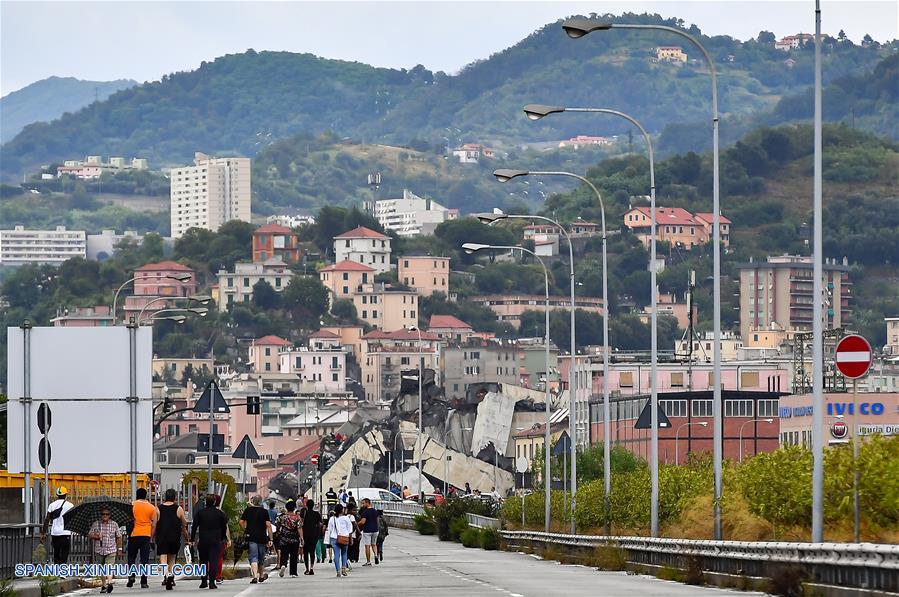 GENOVA, agosto 14, 2018 (Xinhua) -- Vista de un puente parcialmente colapsado, en Génova, Italia, el 14 de agosto de 2018. (Xinhua/Alberto Lingria)
