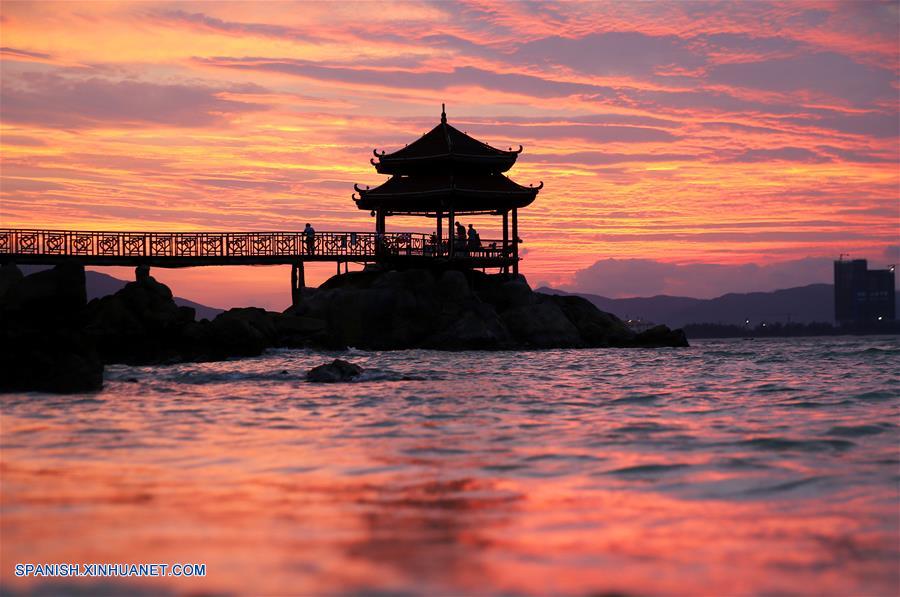 HAINAN, agosto 13, 2018 (Xinhua) -- Imagen del 11 de agosto de 2018 de la vista de la puesta del sol sobre la isla Wuzhizhou, en Sanya, provincia de Hainan, en el sur de China. (Xinhua/Cao Zhengping)